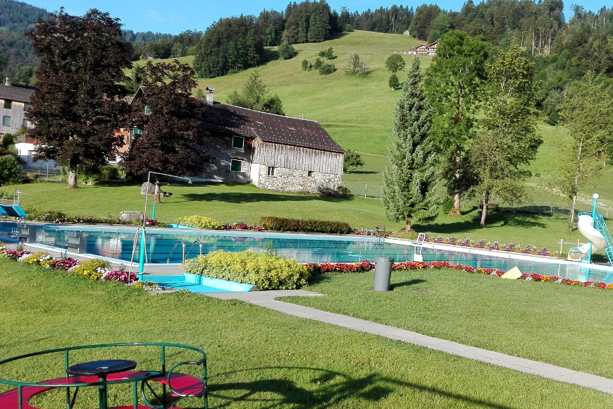 Das Schwimmbad Schwarzenberg liegt oberhalb des Dorfzentrums, umrahmt von Bergen, und lädt ein zum Relaxen oder zum Beachen.